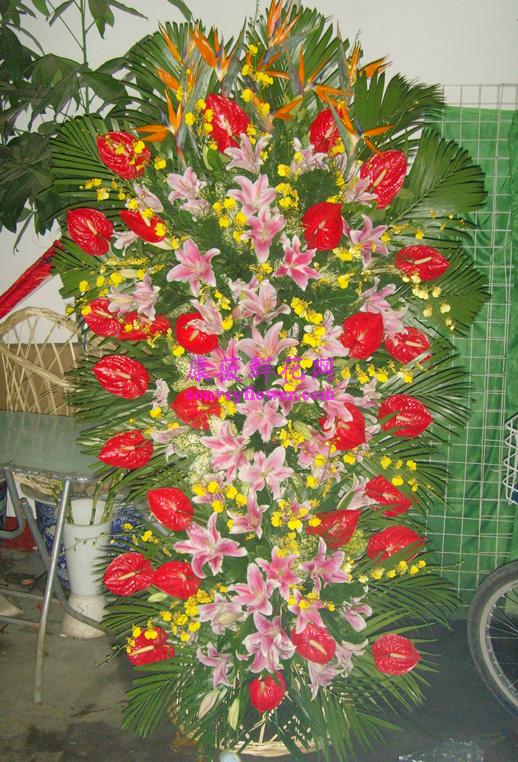 材料:豪华开业篮一个,彩用高档红掌,跳舞兰,百合,大鸟等各种名贵花材组合成高1.8以上花篮一个